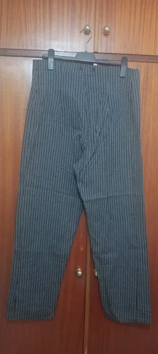 Pantalón campero para hombre con un diseño de rayas finas. - Diseño de rayas verticales. - Tejido cómodo y resistente. - Botones en la cintura para tirantes. -Dos bolsillos pequeños en la parte delantera. - 46 cm de cintura y 112 cm de largo. - Poco uso, en buen estado.