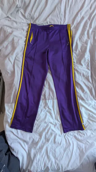 Pantalón deportivo con diseño inspirado en México. - Color principal morado con detalles en amarillo. - Logo de Adidas en la pierna. - Escudo de México en la otra pierna. - Inserciones de color turquesa en los laterales.