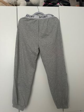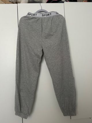 Pantalones deportivos grises de Shein con cinturilla. - Cinturilla elástica con logo. - Puños ajustados en los tobillos.