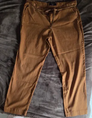 Pantalón de corte chino para hombre, confeccionado en algodón. Talla 52/54 55 centímetros de cintura sin estirar, Caderas 65 centímetros sin estirar Largo 95 centímetros - Cintura con trabillas para cinturón. - Cierre de botón y cremallera. - Bolsillos laterales y traseros.