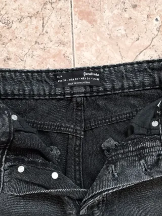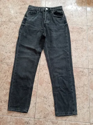 Pantalones vaqueros de corte ancho con lavado en negro y gris. Tienen un diseño desgastado. - Cintura alta. - Cierre de cremallera y botón. - Bolsillos delanteros y traseros. - Un solo uso, en perfecto estado. - Marca: Stradivarious. - Tallaje 34, XS. - Estilo D66.
