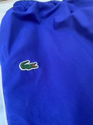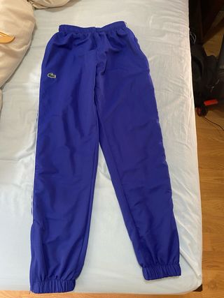 Pantalones deportivos de la marca Lacoste en color azul electrico. - Logo de Lacoste bordado. - Diseño con detalles blancos en los laterales. - Cintura elástica con cordón ajustable. - Puños elásticos en los tobillos.