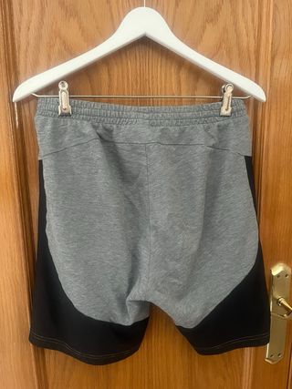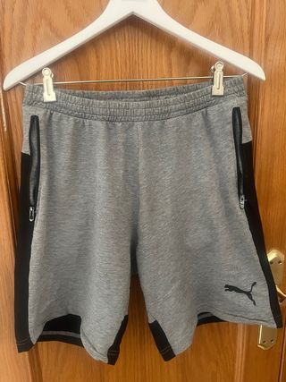 Pantalón corto deportivo de la marca Puma. - Color gris con detalles en negro. - Cremalleras en los bolsillos laterales. - Cintura elástica.