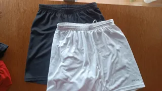 Dos pantalones cortos Kipsta. Uno es de color negro y el otro blanco. - Talla XS. - Cintura elástica con cordón ajustable.