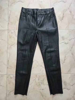 Pantalón de cuero sintético para mujer. - Diseño moderno con costuras. - Cintura elástica. - Bolsillos delanteros.