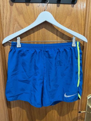 Pantalón corto deportivo Nike en color azul con detalles en verde. - Cintura elástica. - Logo de Nike plateado.