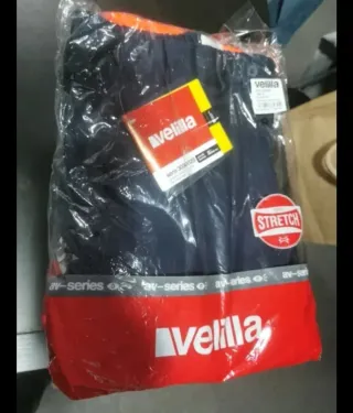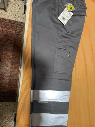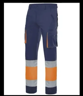 Pantalones de trabajo con detalles en naranja y bandas reflectantes. - Dos bolsillos laterales con solapa y fuelle. - Dos bolsillos traseros. - Cintura elástica. - Cierre con cremallera y botón. - En total 6 bolsillos.