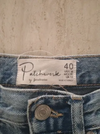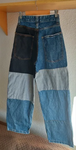 Pantalón vaquero de Bershka con un diseño patchwork único. - Combinación de diferentes tonos de denim. - Corte recto. - Cintura alta.