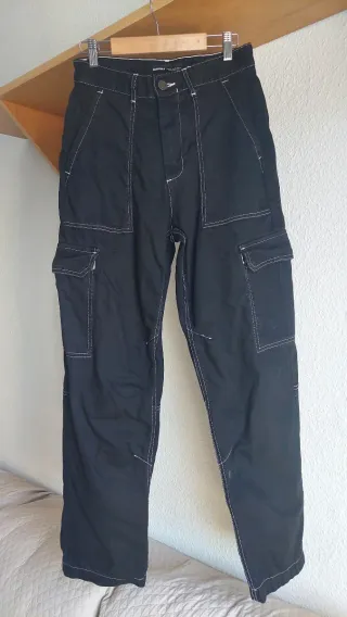 Pantalones cargo de color negro con un diseño moderno y detalles de pespuntes en blanco. - Bolsillos cargo en los laterales. - Cierre de botón y cremallera. - Pespuntes decorativos en contraste.