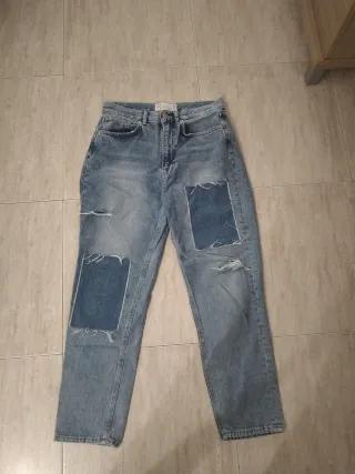 Pantalones vaqueros de Stradivarius con un diseño moderno y desgastado. - Parches de tela vaquera en contraste. - Roturas y desgastes decorativos. - Corte recto.