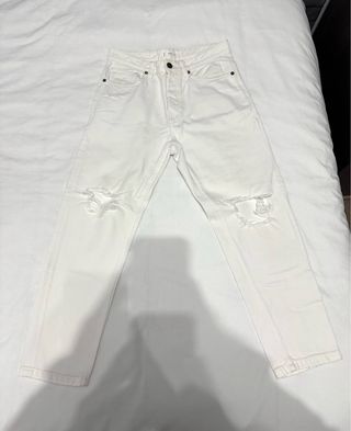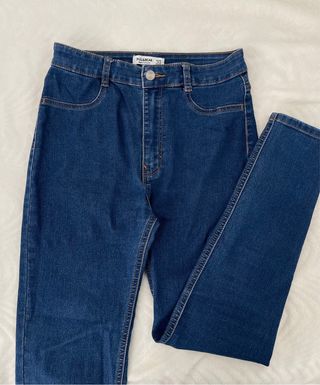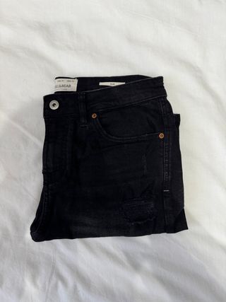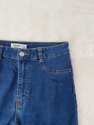 Pantalón vaquero de tiro alto y pitillo. - Corte ajustado. - Diseño clásico de cinco bolsillos. - Cierre con cremallera y botón.