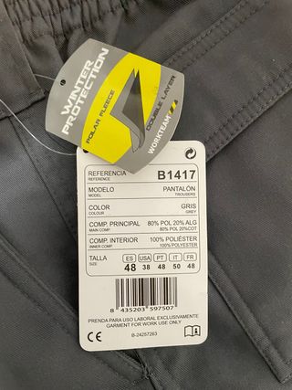 Pantalones de trabajo Workteam, ideales para el invierno con protección polar. - Referencia: B1417 - Color: Gris - Composición principal: 80% Poliéster, 20% Algodón - Composición interior: 100% Poliéster - Tallas disponibles en etiqueta: ES 48, USA 38, PT 48, IT 50, FR 48