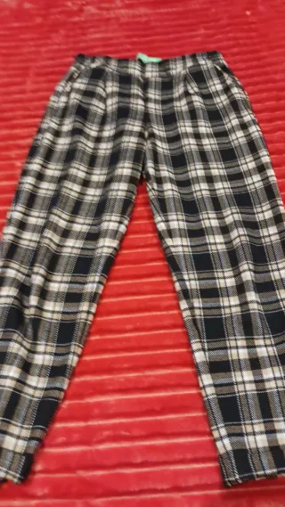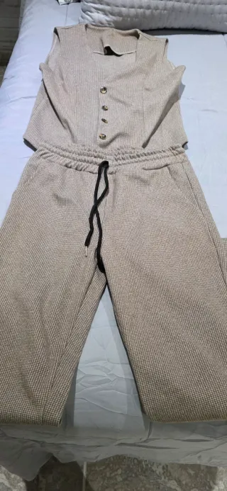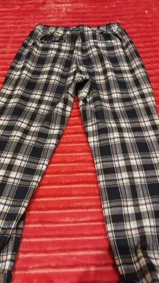 Conjunto de dos piezas con estampado de cuadros. - Chaleco sin mangas con botones. - Pantalón con cintura elástica y cordón negro. Algunas prendas son negociables.