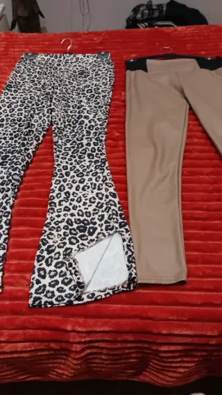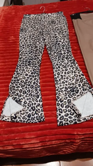 Conjunto de dos pantalones con diseños variados. - Un pantalón liso en tono beige.taĺla xl - Un pantalón con estampado de leopardo y aberturas laterales.talla L elastico