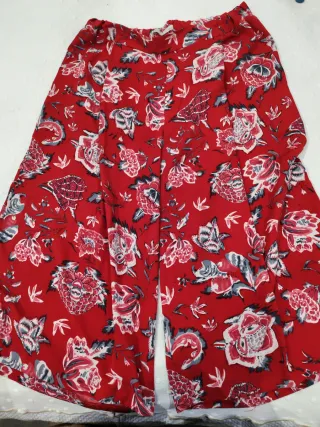 Pantalones largos con un vibrante estampado floral. - Diseño de flores rojas y detalles en blanco y gris. - Cintura elástica para mayor comodidad. - Piernas anchas y fluidas.
