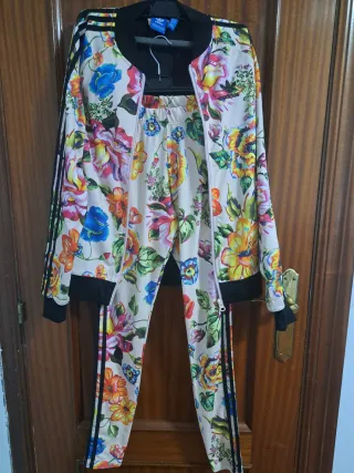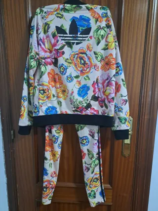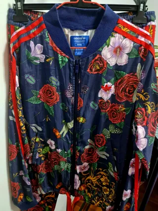 Conjunto deportivo Adidas con un vibrante estampado floral. - Chaqueta con cremallera completa. - Pantalón a juego. - Diseño llamativo y colorido.