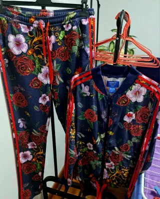 Conjunto deportivo Adidas x Rita Ora con un llamativo estampado floral. - Chaqueta con cremallera completa. - Pantalones con cordón ajustable en la cintura. - Diseño floral sobre fondo azul marino. - Detalles de rayas rojas en mangas y perneras.