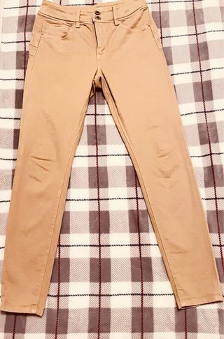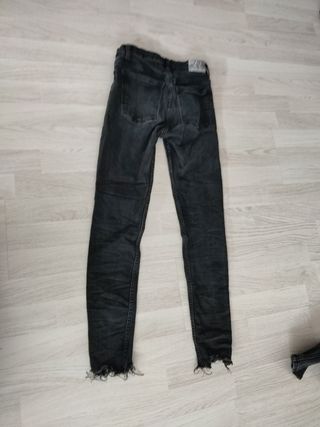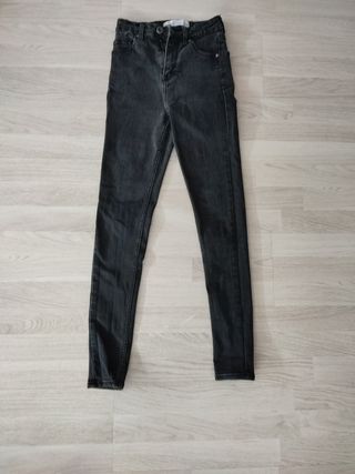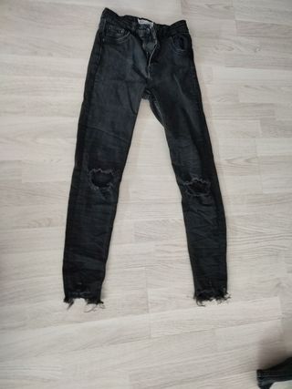 Pantalón vaquero pitillo de la marca Pull&Bear. Un básico para tu armario. Usado bastantes veces pero queda ideal. - Diseño de tiro alto. - Piernas ajustadas. - Detalle de rotura en una rodilla.