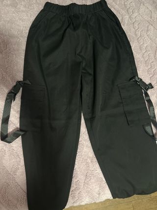 Pantalón de estilo cargo en color negro, ideal para un look moderno. - Cintura elástica. - Bolsillos laterales con tiras y hebillas. - Diseño holgado.