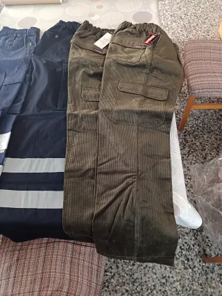 LOS 4 PANTALONES 20€ Conjunto de pantalones de trabajo, ideales para entornos laborales. Aunque las tallas son diferentes valen para la misma cintura. - Marca Work team: Pantalon de color azul marino con detalles reflectantes. Talla 44 - pantalón azul oscuro con detalles reflectantes. Talla 44 - Marca Unimodel: Pantalones de color verde oliva con textura acanalada. Talla 42