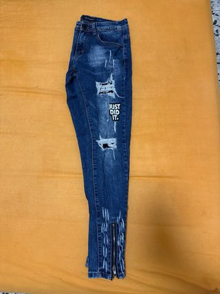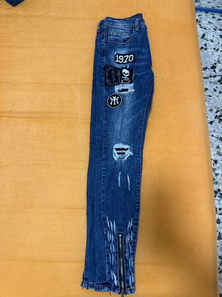 Pantalón vaquero con un diseño moderno y detalles únicos. - Parches decorativos con motivos variados. - Aberturas con cremallera en los bajos. - Roturas y desgastes estratégicos.