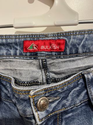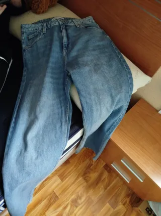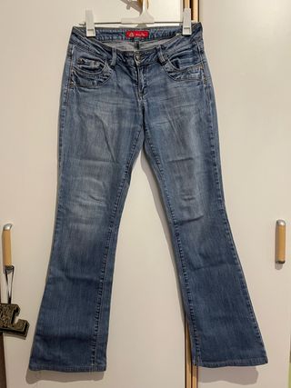 Pantalón vaquero de corte acampanado para mujer. - Diseño clásico de cinco bolsillos. - Cierre de cremallera y botón. - Costuras reforzadas. Tiene dos pequeños roces abajo pero si mides 1,70cm o menos no se apreciarán