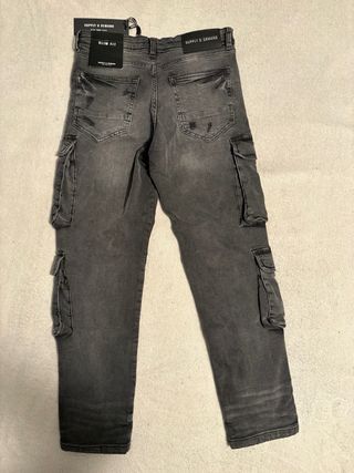 Pantalón vaquero de corte cargo con un acabado desgastado. - Diseño con múltiples bolsillos. - Estilo moderno y urbano. - Estado como nuevo.
