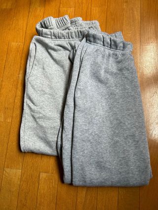 Pack de dos pantalones de chándal cómodos y versátiles. Tienen vellón por dentro por lo que son muy calentitos y perfectos para el invierno.Tienen en algunas partes bolitas que no se aprecian hasta que no te acercas( adjunto foto). - Cintura elástica con cordón. - Bolsillos laterales. - Tejido suave y agradable.