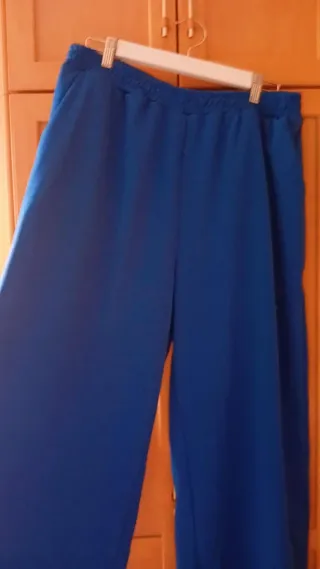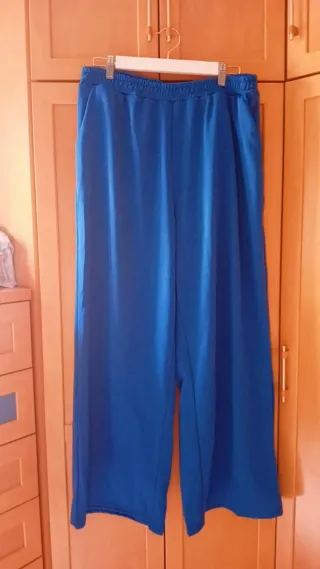 Pantalón de corte ancho y estilo moderno. - Cintura elástica para mayor comodidad. - Bolsillos laterales prácticos. - Tejido fluido y ligero. Pantalón azul Ancho de pierna Talla 1XL Bonito y cómodo Me lo probé y me queda grande Sin uso Bolsillos