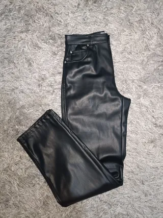 Pantalón de cuero sintético con un diseño moderno. - Material: Cuero sintético. - Color: Negro. - Corte: Recto.