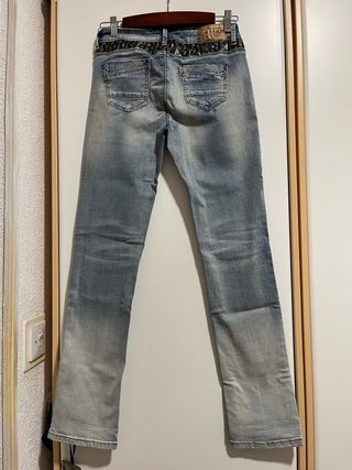Pantalón vaquero de la marca Koroshi para mujer. - Diseño desgastado. - Detalle decorativo en los bolsillos delanteros, traseros y cintura. - Corte recto. - Pone talla 36 pero equivale a una 38