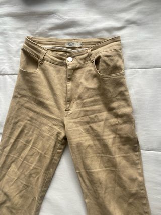 Pantalón de corte recto en color beige, ideal para un estilo casual. - Cintura con trabillas. - Cierre de botón y cremallera. - Bolsillos delanteros. - Bolsillos traseros.