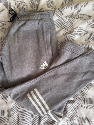Pantalones deportivos Adidas de color gris. Cuentan con un diseño moderno y cómodo. - Cintura elástica con cordón. - Bolsillos laterales. - Detalle de tres rayas en la pernera.