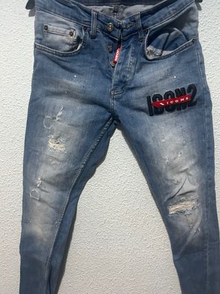 Pantalón vaquero de la marca DSQUARED2 en color azul. Presenta un diseño moderno con detalles desgastados y salpicaduras. - Estilo desgastado. - Detalle de salpicaduras. - Logo ICON2 en la pierna.