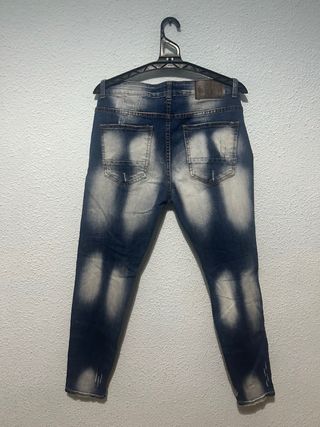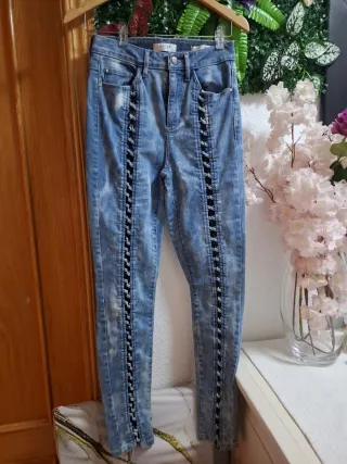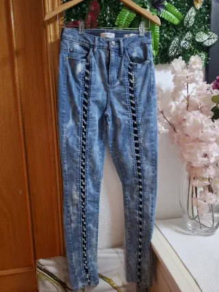 Pantalón vaquero de corte ajustado con un detalle de pedrería en la pierna. - Diseño con pedrería floral. - Tiro medio. - Pierna pitillo. Tiene una diminuta mancha en el bajo.