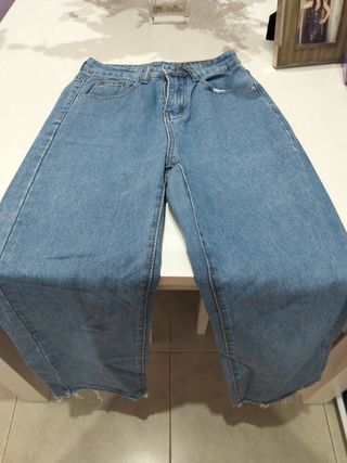Pantalón vaquero de corte ancho para mujer. Un básico versátil para cualquier ocasión. - Diseño de cinco bolsillos. - Cierre de cremallera y botón. - Bajo deshilachado.