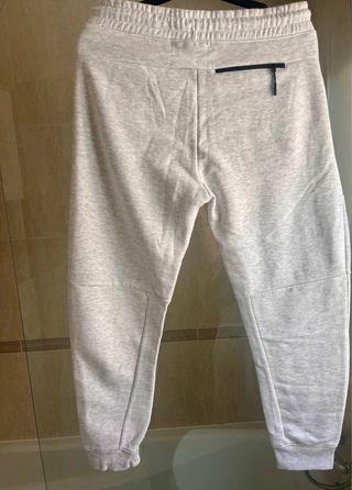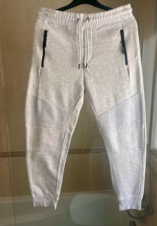 Pantalón de chándal de color gris claro con un diseño moderno. - Cintura elástica con cordón. - Dos bolsillos laterales con cremallera. - Paneles con costuras en las rodillas. - Puños elásticos en los tobillos. Talla M Nuevos