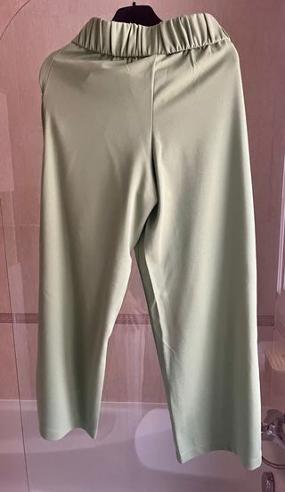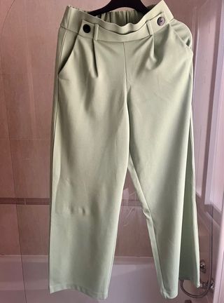 Pantalón de vestir de color verde. - Diseño con pinzas. - Dos botones decorativos en la cintura. - Bolsillos laterales. Talla M Una puesta