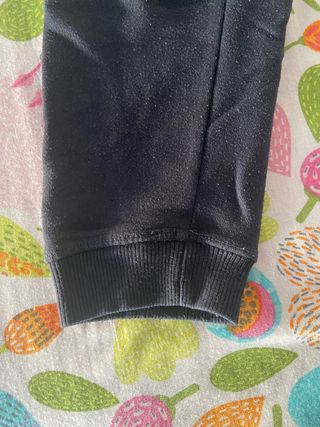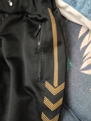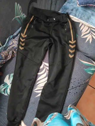 Pantalones de chándal negros en excelente estado, casi nuevos. Presentan un diseño moderno con detalles dorados. - Cintura elástica. - Bolsillos con cremallera. - Ribetes decorativos en los laterales.