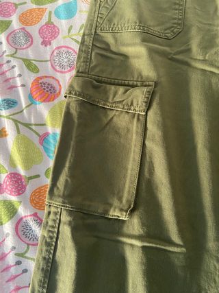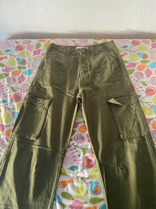 Pantalón de estilo cargo en color verde. Diseño moderno y funcional. - Bolsillos laterales amplios. - Cintura con trabillas para cinturón. - Cierre de botón y cremallera.