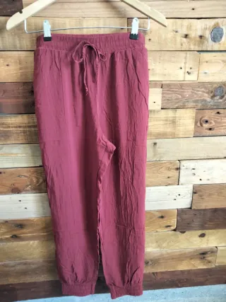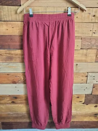 Pantalón largo de color granate con cordón en la cintura. Está en perfecto estado. El tejido es fino pero no transparenta. - Cintura elástica con cordón. - Puños ajustados en los tobillos. - Tejido ligero