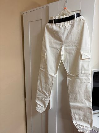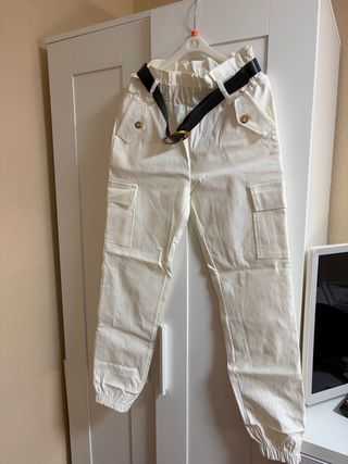 Pantalón estilo cargo en color crema, ideal para chica. Cuenta con un cinturón negro a juego. - Diseño cargo con bolsillos. - Cintura elástica. - Bajo con elástico.