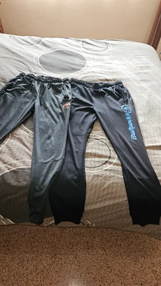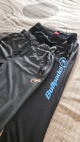 Lote de dos pantalones de chándal de la marca Bullpadel. - Uno de color gris con logo naranja delante y detrás. - Otro de color azul oscuro con logo en la pierna. - Ambos con cintura elástica y cordón de ajuste. - Bolsillos laterales con cremallera.