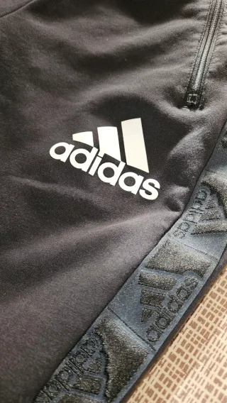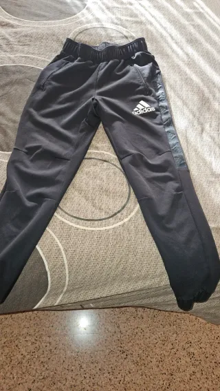 Pantalón de chándal Adidas en color negro. Diseño deportivo y cómodo. - Cintura elástica. - Bolsillos laterales con cremallera. - Detalle de banda lateral con logo.