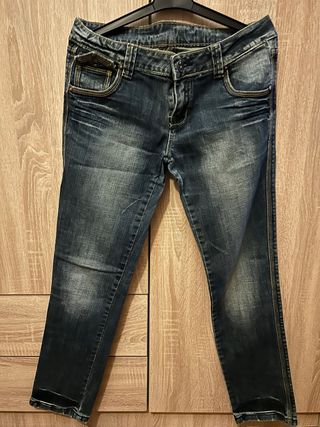 Pantalón vaquero en muy buen estado talla XL. - Tono azul oscuro. - Detalles de cadenas en bolsillos traseros. - Cierre de cremallera y botón.