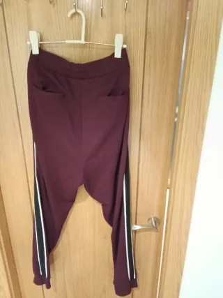 Vendo Pantalón de la marca Zara en color granate talla L. Presenta un diseño moderno con detalles de rayas en los laterales. Es tipo chándal pero actual para salir de paseo o a tomar algo. Acepto pago por wallapay. - Raya lateral en blanco y negro. - Cintura elástica.