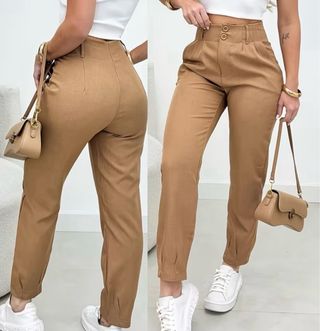 Pantalón de vestir en tono caqui, ideal para un look elegante. - Diseño de talle alto. - Cierre con botones. - Bolsillos laterales.