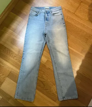 Pantalón vaquero de corte recto y tiro alto. - Lavado claro. - Bolsillos delanteros y traseros. - Cierre de cremallera y botón.