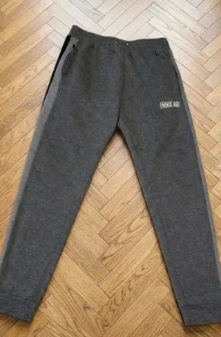Pantalón deportivo Nike Air de color gris y talla S. Presenta un diseño moderno con detalles laterales. - Logo de Nike Air en la pernera. - Cintura con cordón ajustable. - Bolsillos laterales. -Pone talla XL en la etiqueta pero es S de adulto.