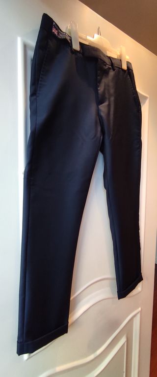 Pantalón de la marca Silbon, azul marino, talla 38 y estira hasta 40 cm o un poco más, a pesar de ser una 38 da mas talla, cintura es elástica, así como los tobillos, con un diseño moderno y cómodo, usado pero en buen estado.
